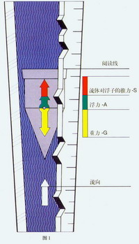 浮子式流量計(jì)是一種變面積式流量計(jì),它通常具有一段直立的錐管和一只可以在其中自由的隨流量大小上下移動(dòng)的浮子(如圖1)。當(dāng)流體自下而上流經(jīng)錐管時(shí),流體的動(dòng)能在浮子上產(chǎn)生的推力S和流體的浮力A使浮子上升。隨著錐管內(nèi)壁與浮子之間的環(huán)形流通面積增大,流體動(dòng)能在浮子上產(chǎn)生的推力S隨之下降。當(dāng)推力S與浮力之和等于浮子自身重力G時(shí),浮子處于平衡,并穩(wěn)定在某一高度上,該高度位置對(duì)應(yīng)的刻度指示流過流量計(jì)的流量。